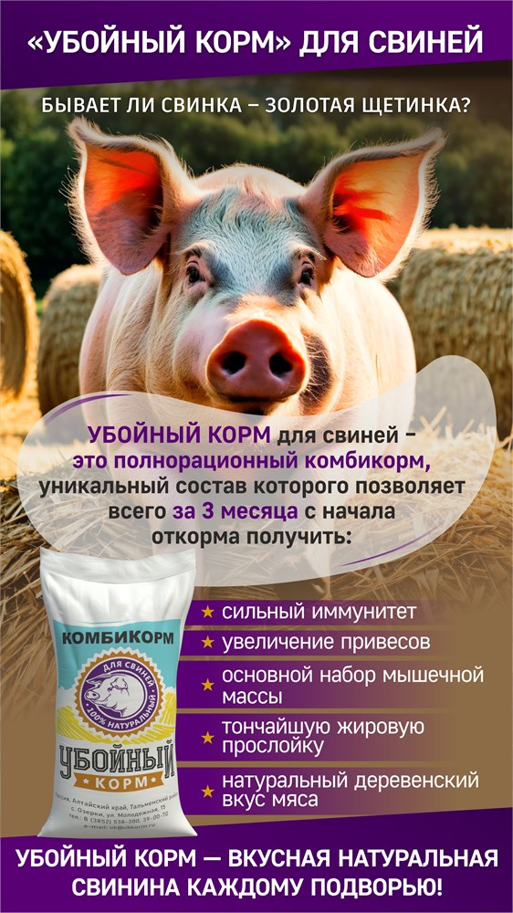 УБОЙНЫЙ КОРМ для свиней – это полнорационный комбикорм, уникальный состав которого позволяет всего за три месяца с начала откорма получить: